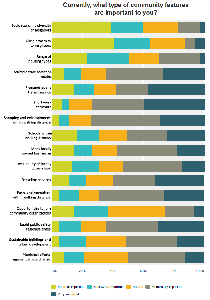 While in general the other features seem to be favorable to respondents, the biggest neutral response was ‘opportunities to join community organizations’; 73 percent of respondents ranked this unimportant or neutral. Again, this may be related to online communities competing with physical ones, and presents an interesting dilemma for organizations that are trying to attract young members. For what it’s worth, I’ve experienced this phenomena firsthand in groups that I’ve participated in and believe it’s a challenge worth tackling. Young professionals have a variety of skills, viewpoints, and energy that can benefit community organizations.