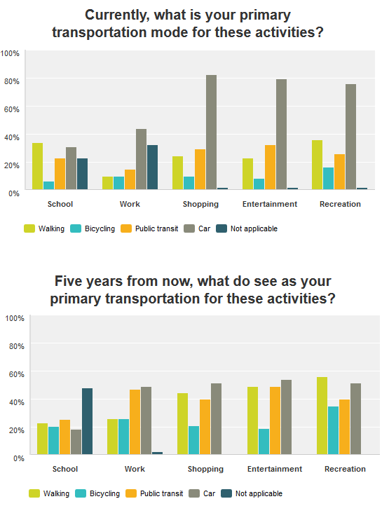 The comparison between these two charts is one of the most intriguing results. Currently, for activities other than school, respondents overwhelmingly travel by car, with walking and transit following far behind. In the future, alternative transportation is expected to be much more competitive with cars. Added together, walking, biking, and transit make up greater percentages of expected travel than cars; 75 percent of responses for future shopping, for example, were alternative. These modes are most feasible within dense and walkable urban areas, which correlates with the previous chart on living situations.