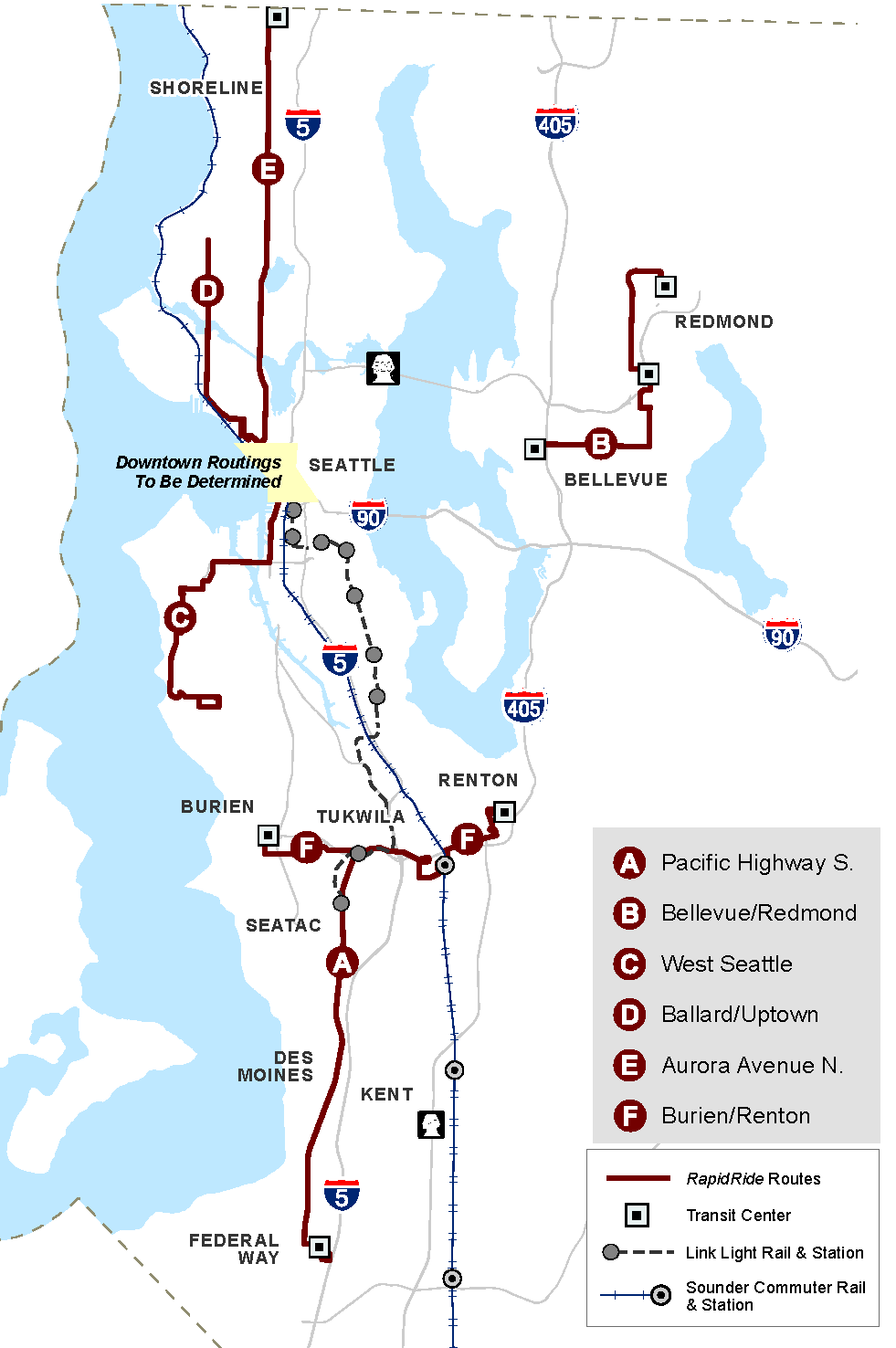 RapidRide was funded as part the Transit Now funding package approved by county voters in 2006, which used a .01 percent sales tax increase to fund transit improvements. The revenue also supported increased bus service hours, vanpool programs,and paratransit assistance, but much of these have been scaled back since the 2008 recession caused sales tax revenue to decline. With the 2010-2011 budget, the county council directed the tax to support existing services. However, RapidRide has survived the Metro funding crisis thanks to millions in state and federal grants. The A line launched in October 2010 with 50 stations and stops between the Tukwila light rail station and the Federal Way Transit Center. A year later the B line launched between Bellevue and Redmond, and in September 2012 the C and D lines opened from West Seattle and Ballard, respectively, to downtown Seattle. (See Metro’s website for detailed route information.)