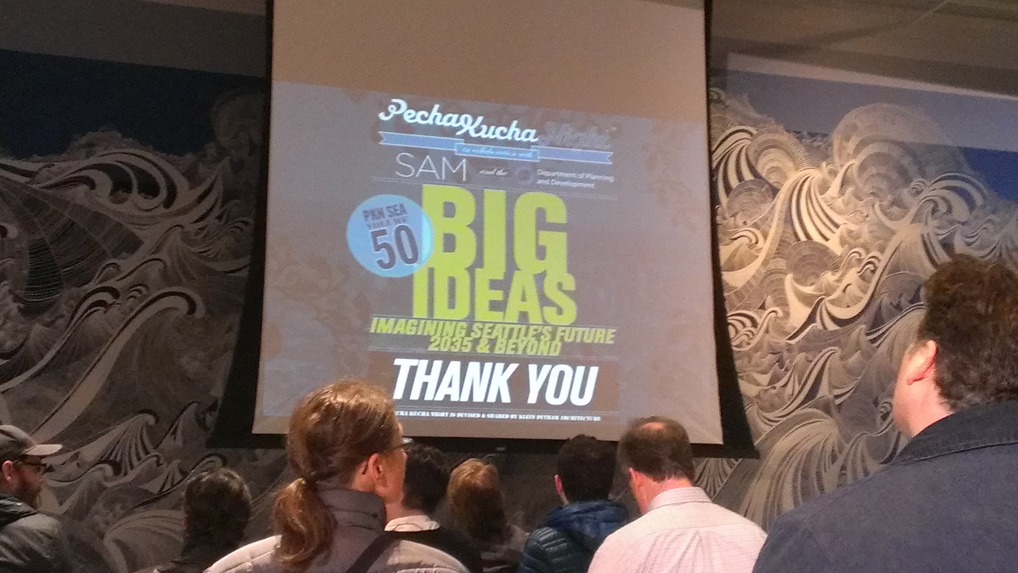 On Thursday night a crowd of hundreds gathered to share ideas for Seattle’s future. Co-hosted by the Seattle Art Museum and the city’s Department of Planning and Development, the evening kicked off the city’s comprehensive plan update process that will culminate next year with new guidelines and a refined vision branded as Seattle 2035. Local government officials, professionals, and artists presented their thoughts in rapid-fire Pecha Kucha style with only 20 slides and 20 seconds each. What emerged was a sobering look at the challenges Seattle faces mixed with an optimistic spirit of hope and extraordinary triumph.