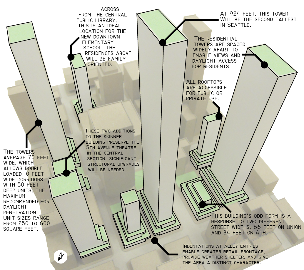 I was following the ongoing saga to establish a downtown elementary school, which is currently on hold, and realized this site is an opportunity to vastly increase residential capacity and make the downtown a 24-hour family-friendly neighborhood. This would require residential towers to replace existing buildings, so my first step was to look at which structures were worth preserving and which could go. Simplistic criteria based on architectural significance, economic productivity, and social contribution found that much of the site could be wiped clean. The Olympic Hotel, Rainier Tower, Skinner Building, Cobb Building, and Financial Center would stay. I assumed the federal post office and a private parking garage along Third Avenue would be acquired.