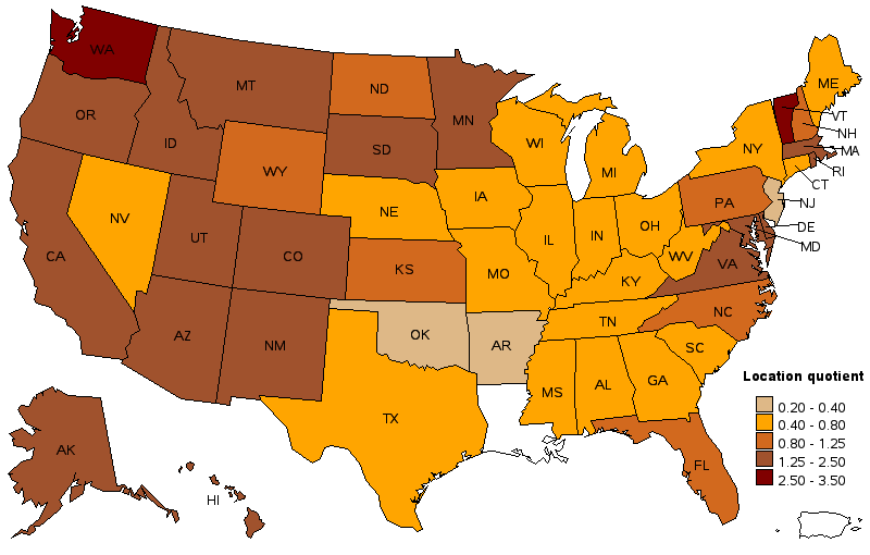 When concentration is broken down by metropolitan areas, Washington claims four of the top ten spots. Number one is Olympia, the state capital. Again, this isn’t too surprising if its explained by the state government employing many planners to oversee the GMA. But interestingly (or alarmingly), Kitsap County ranks third in the entire country. This is where I work. The peninsula is not exactly a bustling urban center and my department is actually understaffed, which makes me wonder what Bainbridge Island and Poulsbo are up to. Mid-sized Bellingham takes the eighth spot and the Seattle metro, finally, is at number ten. Three California metros also make the list.