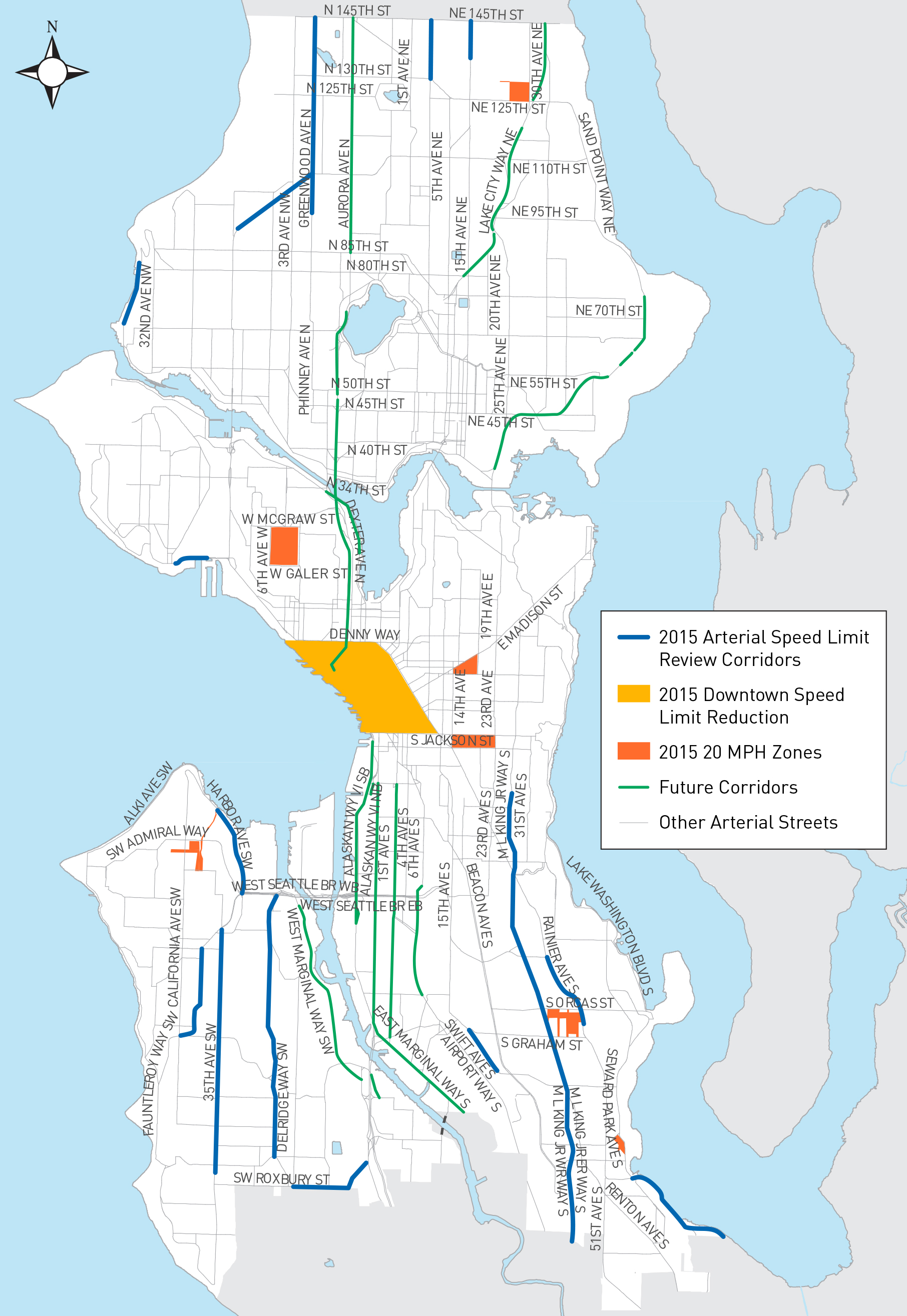 Speed limits will be reduced to 30 mph or lower on a number of arterial street segments, including the downtown streets where most collisions occur. There speed limits will be reduced to 25 mph in some places, and several streets be targeted for technological and design improvements like eliminating double turn lanes, starting walk signals several seconds before green lights, and prohibiting right turns on red lights. Specific locations include intersections with 5th, 6th, and 7th avenues between Olive Way and James Street.