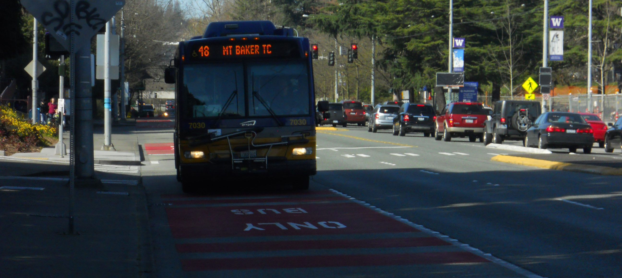 Investments like bus-only lanes and traffic signal priority could also help make service more reliable for all riders. Photo by the author.