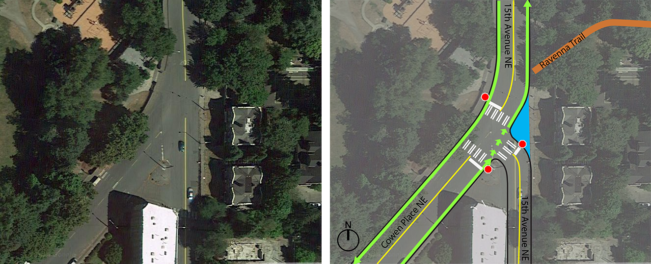 Further south at the intersection of Cowen Place and 15th Avenue will be one of the project’s more intriguing aspects. Currently this intersection is a no man’s land for people on foot, with unclear crossings movements and a huge southbound curb radius. With new PBLs on both Cowen and 15th, something needs to change. As with 62nd, new crosswalks can’t be installed at the current intersection. So he plan is to create an all-way stop with a new bulb-out to the east, making a T intersection. This allows smoother movement for all users and a better connection to a flat, unpaved trail above Ravenna Park. There is also a bus stop here that needs to be accomodated. The intersection might be something like the image below.