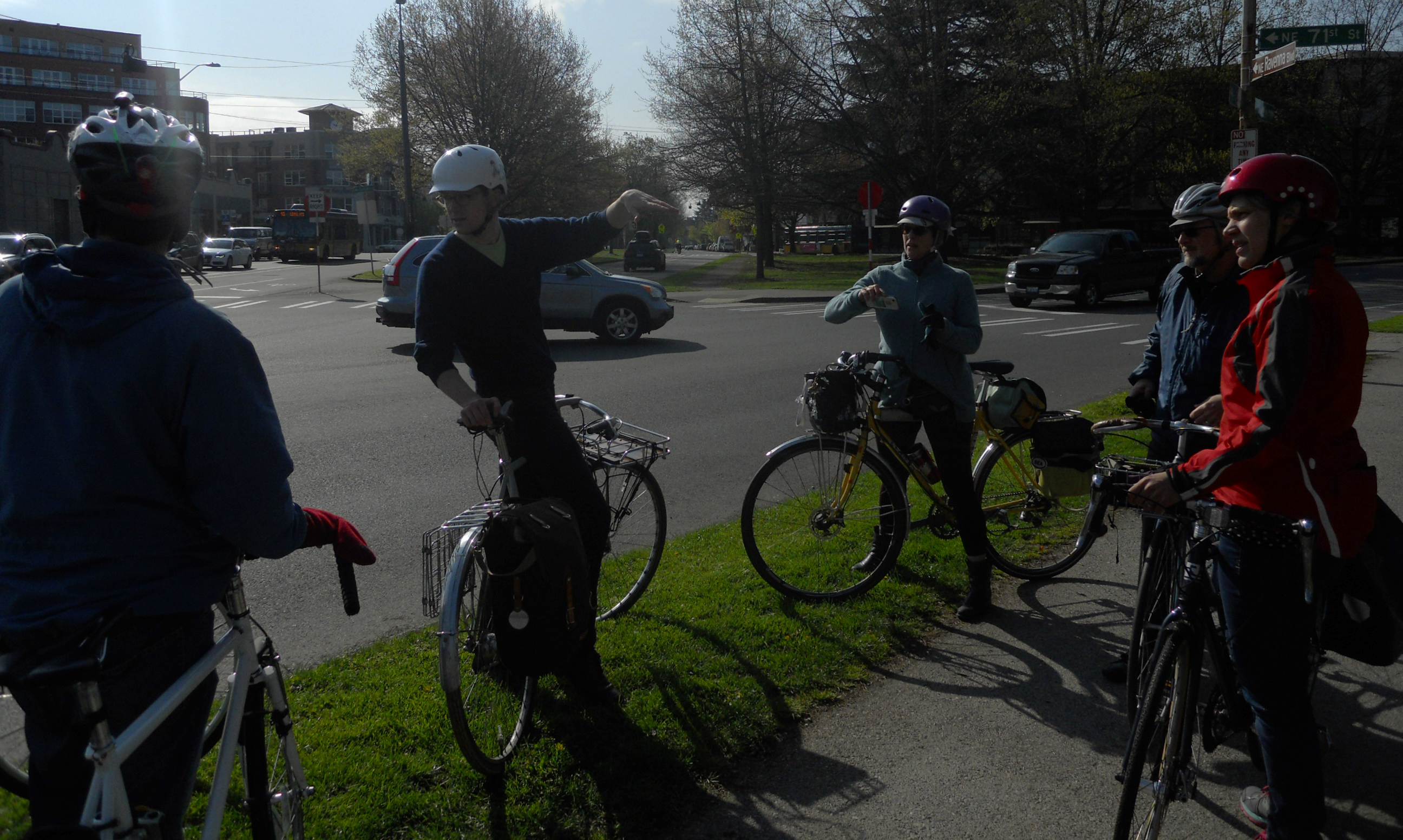 With a $200,000 budget the project can’t include all of the bells and whistles. The preferred features were discussed on Sunday by a group of local residents and Seattle Neighborhood Greenways members who rode along the project route. Organized by Brock Howell, policy and government affairs manager for Cascade Bicycle Club, we primarily discussed the issues at intersections. At three signalized intersections the bike lane and a left-turn lane for cars swap places, resulting in the setup pictured at the top of this post. It would be ideal to have the PBL stay on the left, but to help prevent bike-car collisions would require expensive new traffic signals. At the very least, SDOT will be able to paint pathways across intersections to make movements more clear. There will also be a painted bike box for right turns onto the new Roosevelt PBL when that repaving project is done later this year.