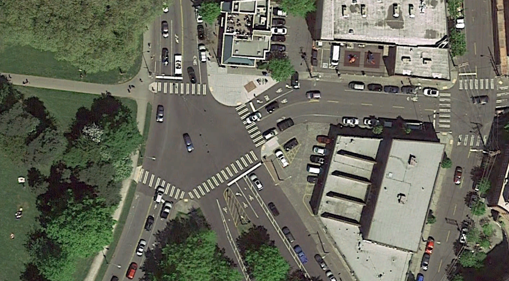 Yet another problem is at the west end of the project area, the intersection with Green Lake Way and Ravenna Boulevard. It’s a weird shape and uncontrolled, but because drivers move slowly there haven’t been any serious injuries here in recent history. Still, it would be ideal to make the intersection smaller and remove turn lanes to make everyone’s movements more predictable. A paint-and-bollard bulbout at the west side is possible for this project, but SDOT did some reconstruction here recently and isn’t interested in a more solid fix.