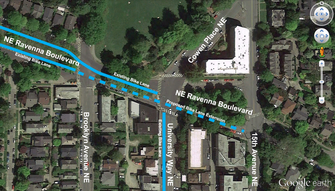 The north end of the new 12th Avenue NE greenway doesn’t have a left-turn option for people on bikes. The Ravenna median blocks through movement. Unless they’re adventurous, bicyclists need to turn right, go down to Brooklyn, and turn around. Preferably there would be a path through the median, like there are for cars in other places. However, the median is actually a park controlled by the Parks Department and part of the city’s prestigious Olmstead Boulevards system. The department is reluctant to change anything, even though the median is already heavily used by people walking, jogging, and playing spots.