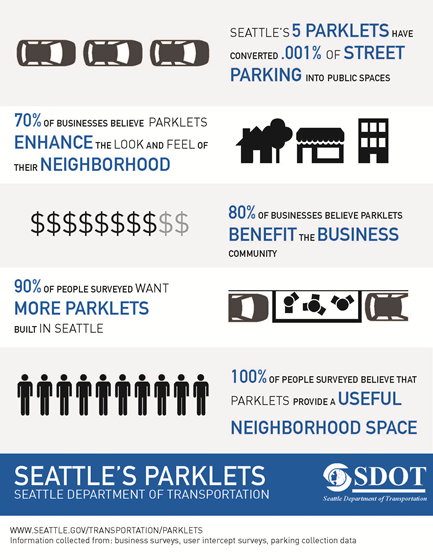 Seattle launched its pilot parklet program in 2013, and since then has seen only positive effects where they go in. They take up very little space while enhancing neighborhood appearance and benefiting businesses. There is widespread public support, and Seattleites want more of them. They also cost much less than acquiring land and building a formal public park.