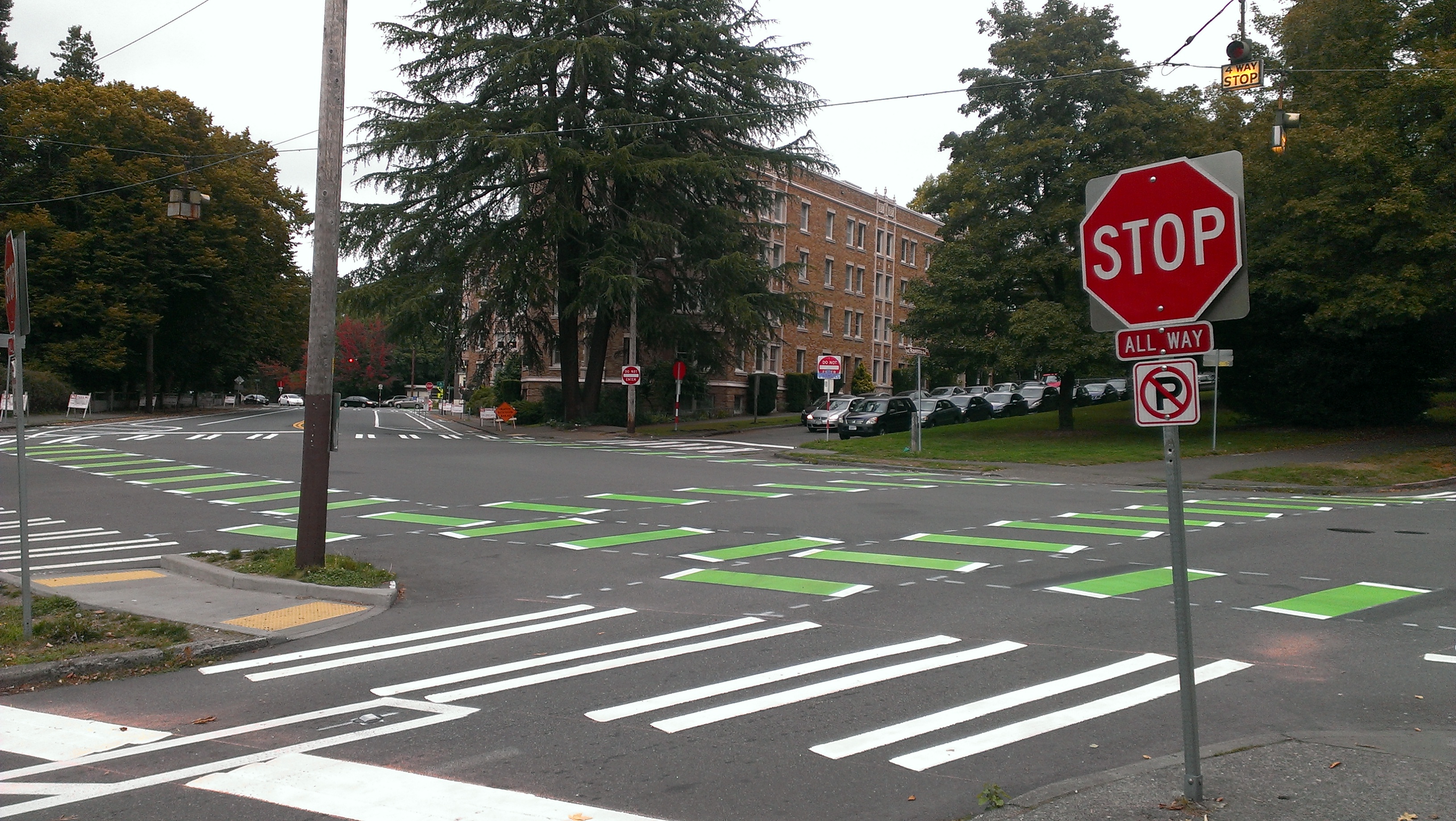 Another big change is the redesign of a dangerous intersection, Cowen Place and 15th Avenue. A huge curb radius on the north side of the intersection and a complete lack of crosswalks encouraged vehicles to speed through the area. Now the intersection has been made into an all-way stop with crosswalks and PBL markings. 15th Avenue is broken into two segments to square up the intersection, a tactic that encourages stop sign compliance and to facilitate the heavy bus traffic that moves between Cowen Place and the north part of 15th Avenue. The bus stops at this location were temporarily relocated two blocks south (right next to my old apartment, actually), but they won’t be used once the U-Link bus restructure move buses off of 15th Avenue next spring.