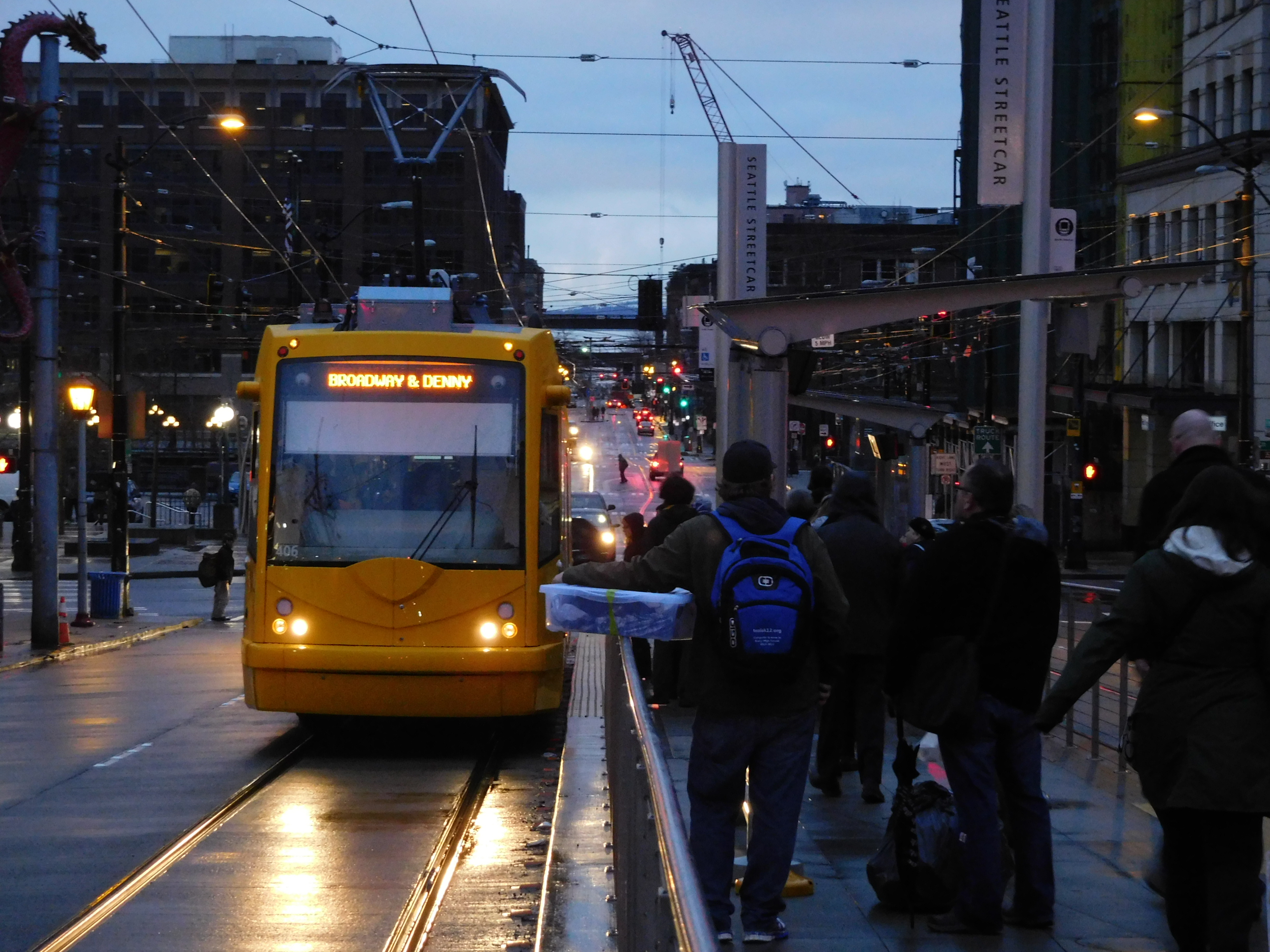 Seattle’s new streetcar route, the First Hill line, finally opened on Saturday. Despite the cold and rain, months of tantalizingly empty test runs and the promise of free rides drew large crowds along the entire route. The new line runs from Pioneer Square and the International District on Jackson Street, through the Yesler Terrace public housing development via 14th Avenue E and E Yesler Way, and on First Hill and Capitol Hill via Broadway. Though over a year late due to manufacturing problems, and designed less robustly than it could have been, the line adds a new transportation link for central Seattle and provides lessons for how future streetcar lines should be designed elsewhere.
