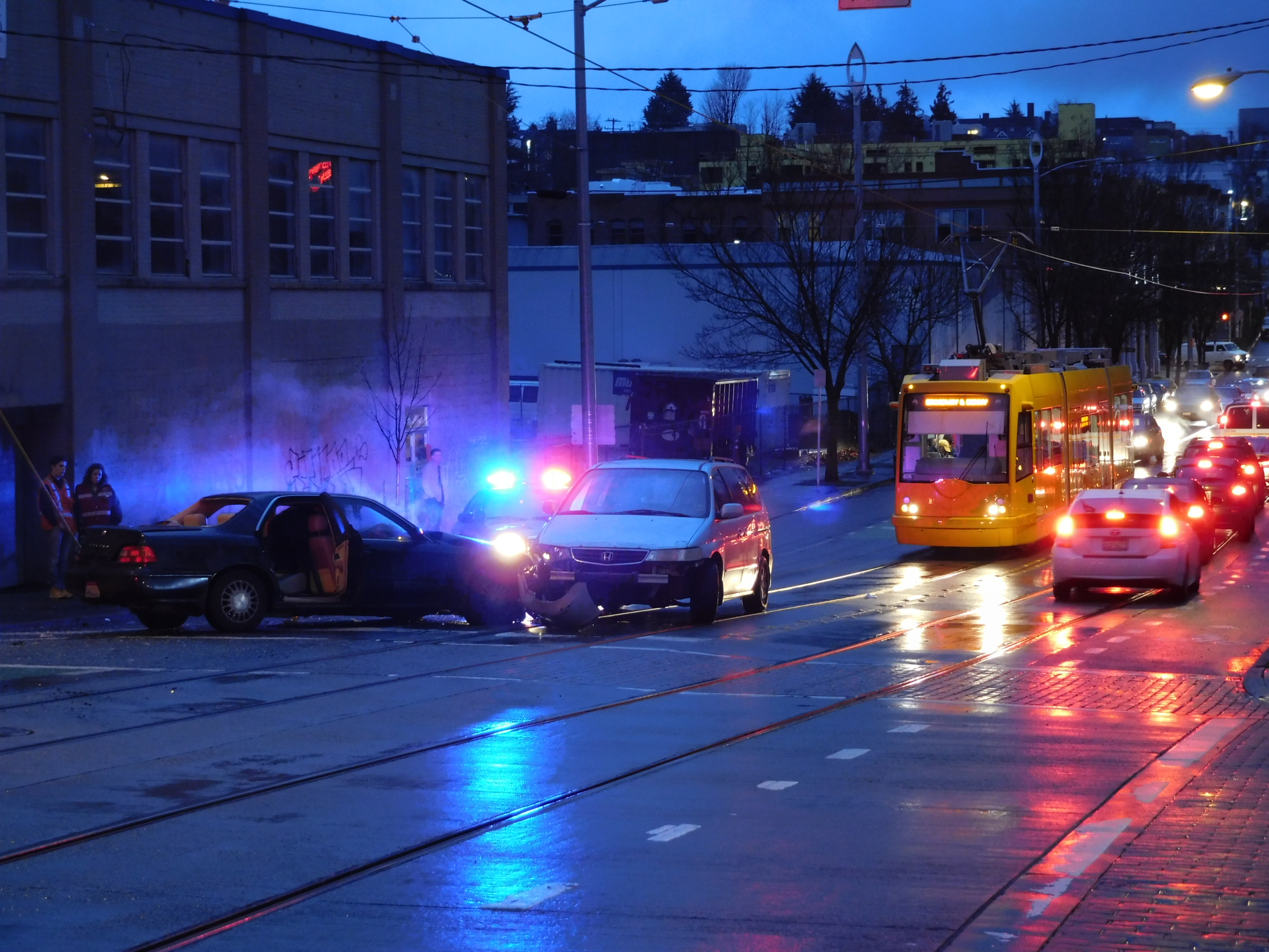 A three-car collision at 12th Avenue E and E Yesler Way blocking the First Hill streetcar on its first day of operations. (Photo by the author)