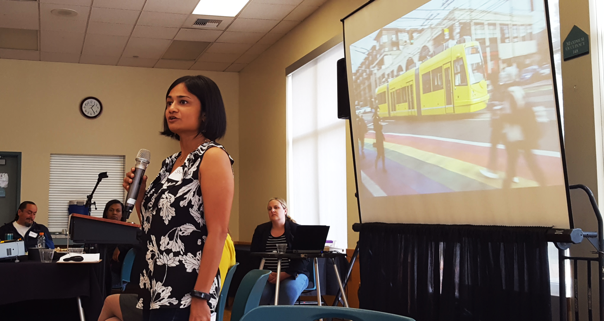 Shefali Ranganathan, Executive Director of Transportation Choices Coalition, noted that Capitol Hill has a rich variety of mobility options. She said 60 percent of the neighborhood’s trips are by foot, bike, transit, carpooling, or ride-sharing. The need for owning a car, which she said costs up to $9,000 per year, is on the decline. She also focused on the impact of parking on housing costs, and cited research showing structured parking increases rents even for tenants who don’t use a parking space. She pitched more efficient use of city streets, like bike lanes, bus lanes, and paid parking, declaring “Free parking is not a God-given right” to a round of applause.
