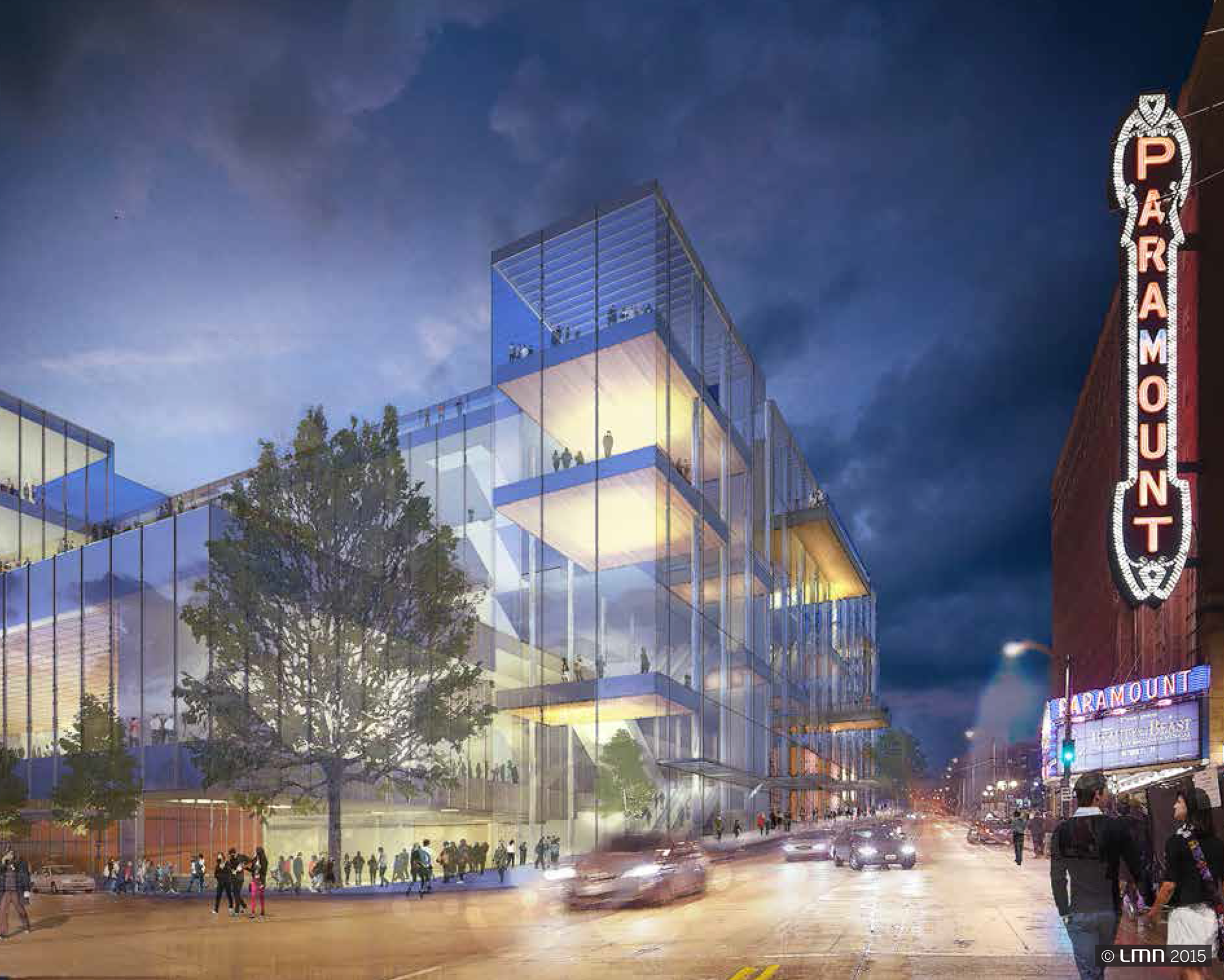 Rendering of the Convention Center Addition, at the corner of Pine Street and Boren Avenue next to Interstate 5. (LMN Architects, Washington State Convention Center)
