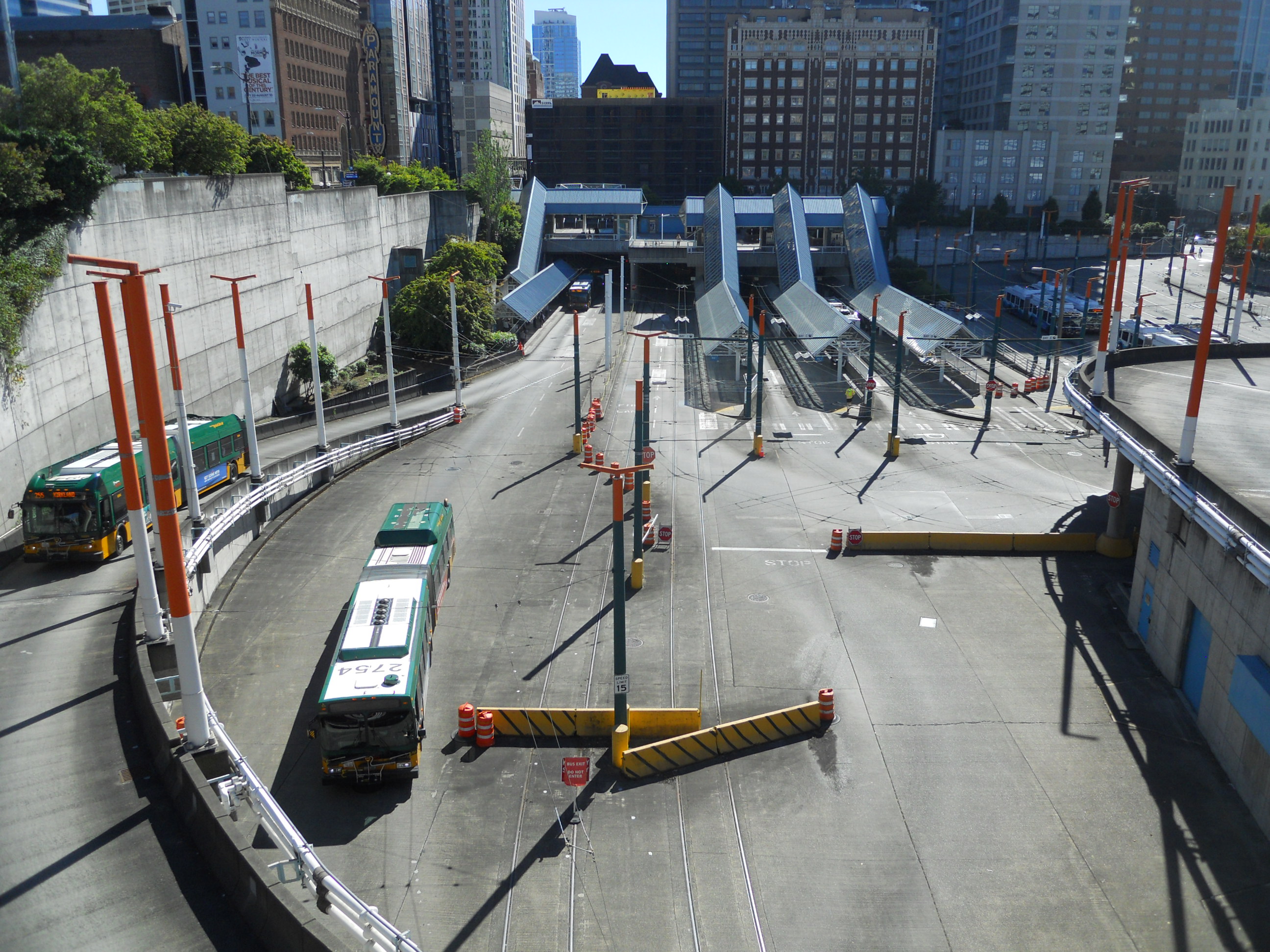 The project site is currently operating as Convention Place Station, a bus layover and passenger facility owned by King County Metro Transit. From a design standpoint, the station’s replacement with any more active use should be a relief to urbanists. The 4 acre site sits approximately between 20 and 50 feet below street level and is essentially an open pit next to residential and office towers.