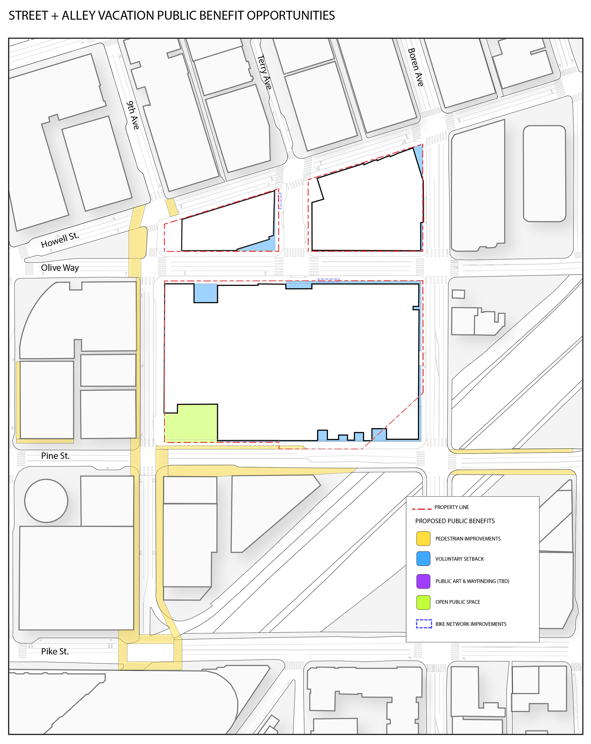 The large footprint of the project – bound by Howell Street, Boren Avenue, Olive Way, and 9th Avenue – necessitate the WSCC’s request to vacate three city-owned alleyways, which total 7,666 square feet. Today the alleyways are not used in any significant public capacity; one dead ends at I-5 and the two others sit between parking lots.