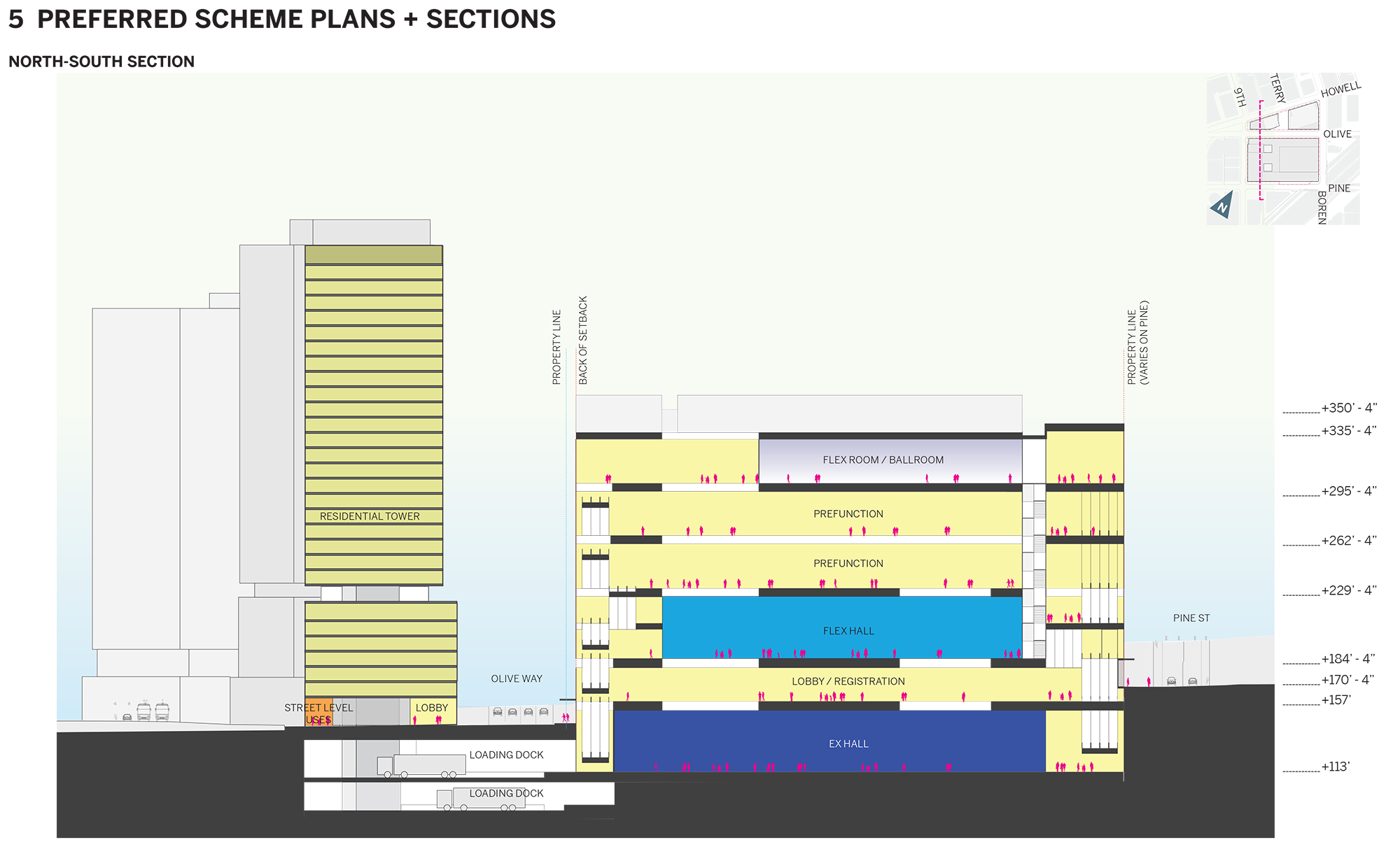 The main portion of the project is a 1.5 million square feet convention building set to break ground in 2017 and open by 2020. The project developer is Pine Street Group and the lead architect is LMN Architects, with landscape design led by GGN and engineering overseen by MKA.