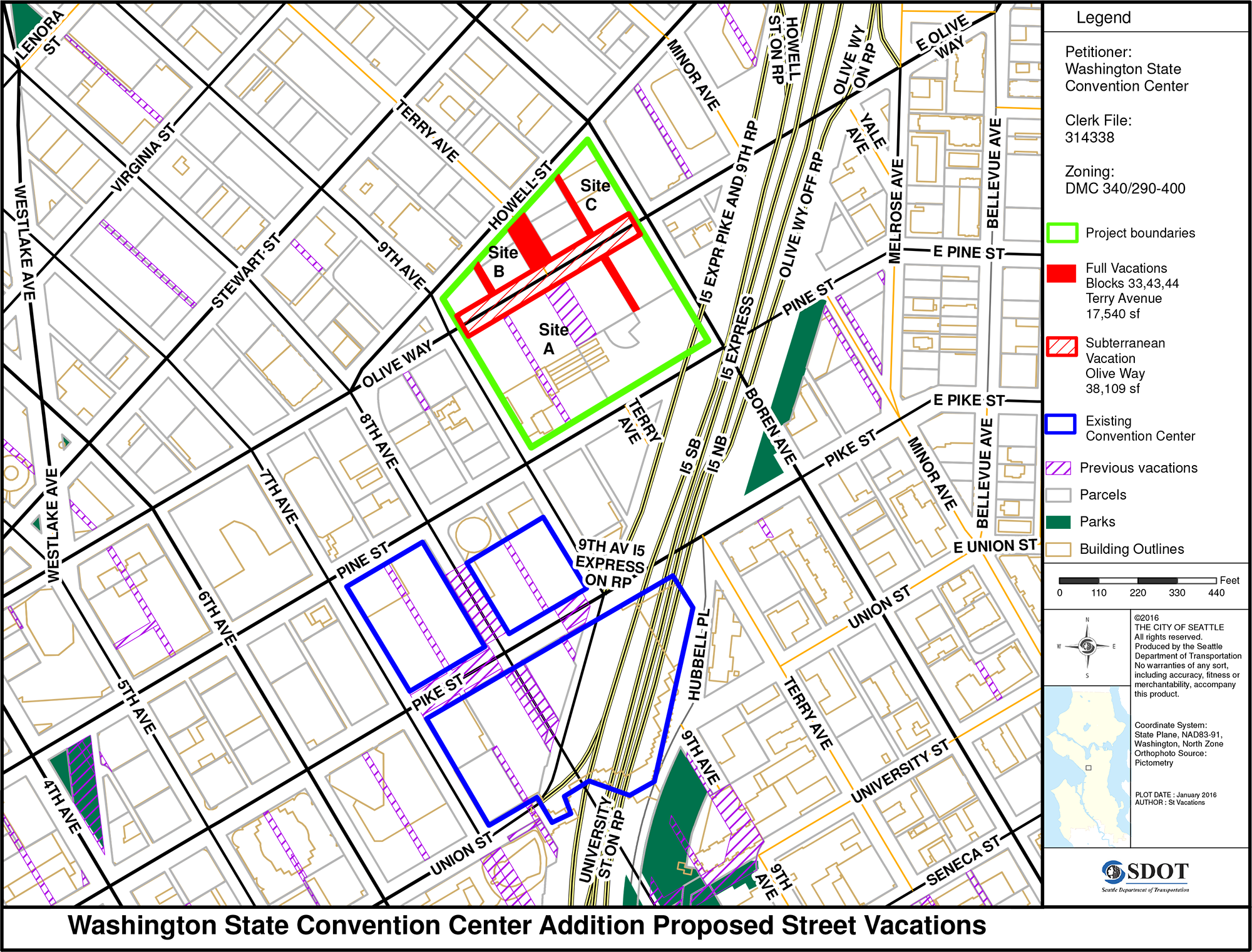 Map of existing and proposed vacations for the WSCC Addition project. (Seattle Department of Transportation)