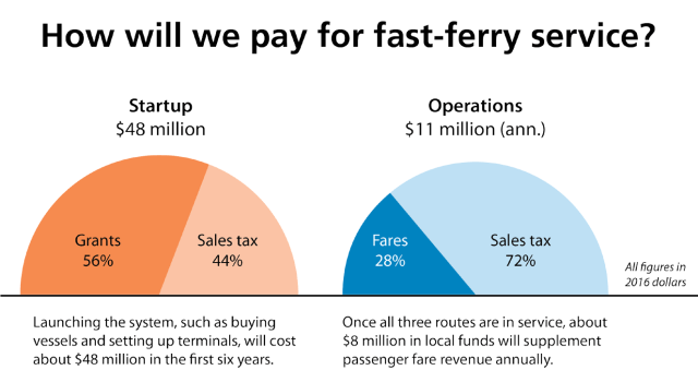 The idea lived on, however, when the state and Kitsap Transit secured federal funding to study the environmental conditions. The study concluded that a catamaran with a foil could achieve high speeds with low wake, and in 2009 the $5.9 million prototype Rich Passage I was delivered. Kitsap Transit then worked on a business plan that found a 0.3 percent sales tax could fund capital projects, operations, and maintenance. In the 2016 general election voters approved the tax, which will raise about $12 million a year.