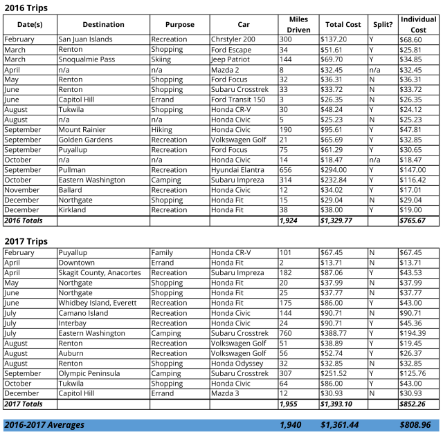 - I’ve also excluded personal trips that originated outside of Seattle, such as when I used Zipcar for sightseeing during trips to Denver and Los Angeles.