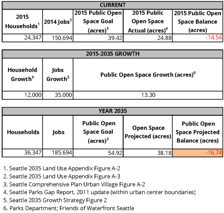 The 2016 Comprehensive Plan update dropped these quantitative goals at the recommendation of the Washington State Office for Recreation and Conservation, which suggests adopting a system-based approach that considers walkable access, number of visitors, programs, and budget allocations. A simple ratio method also becomes self-defeating as density increases within a constrained area. However, it is still helpful to understand historical goals for Downtown. Using Comprehensive Plan data, an analysis shows today there is a parks deficit of over 14 acres. Accounting for growth and even 13 acres of planned open space with Waterfront Seattle, by 2035 the deficit will grow to 17 acres.