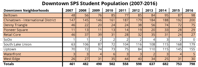 More Seattle Public School students are calling Downtown home. The red shaded neighborhoods are those included in the study area. Some Downtown children attend nearby private schools and are not reflected in this data. (Seattle Public Schools)