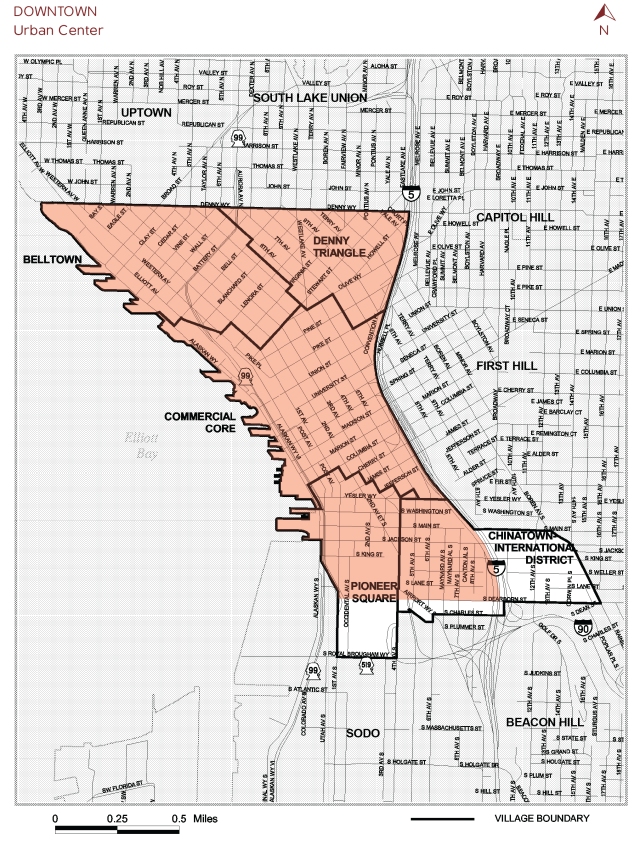The study area includes most of Chinatown-International District and Pioneer Square and fully encloses the Commercial Core, Belltown, and Denny Triangle. Arguments can be made for different boundaries in all directions, but this is a reasonable start provided the limited capacity of a volunteer writer. I may return with a broader scope, and requests for further information can be shared on the contact page.