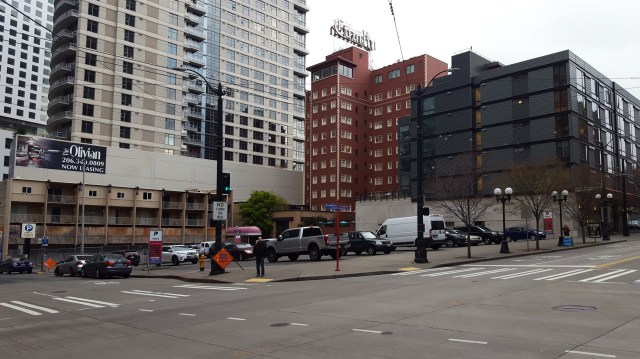 One of the last large parking lots in Downtown at 8th and Pine will soon be redeveloped with a 55-story apartment and hotel tower. (Photo by author)