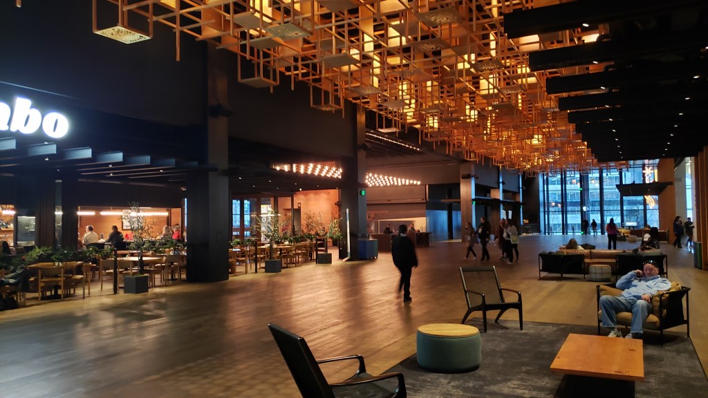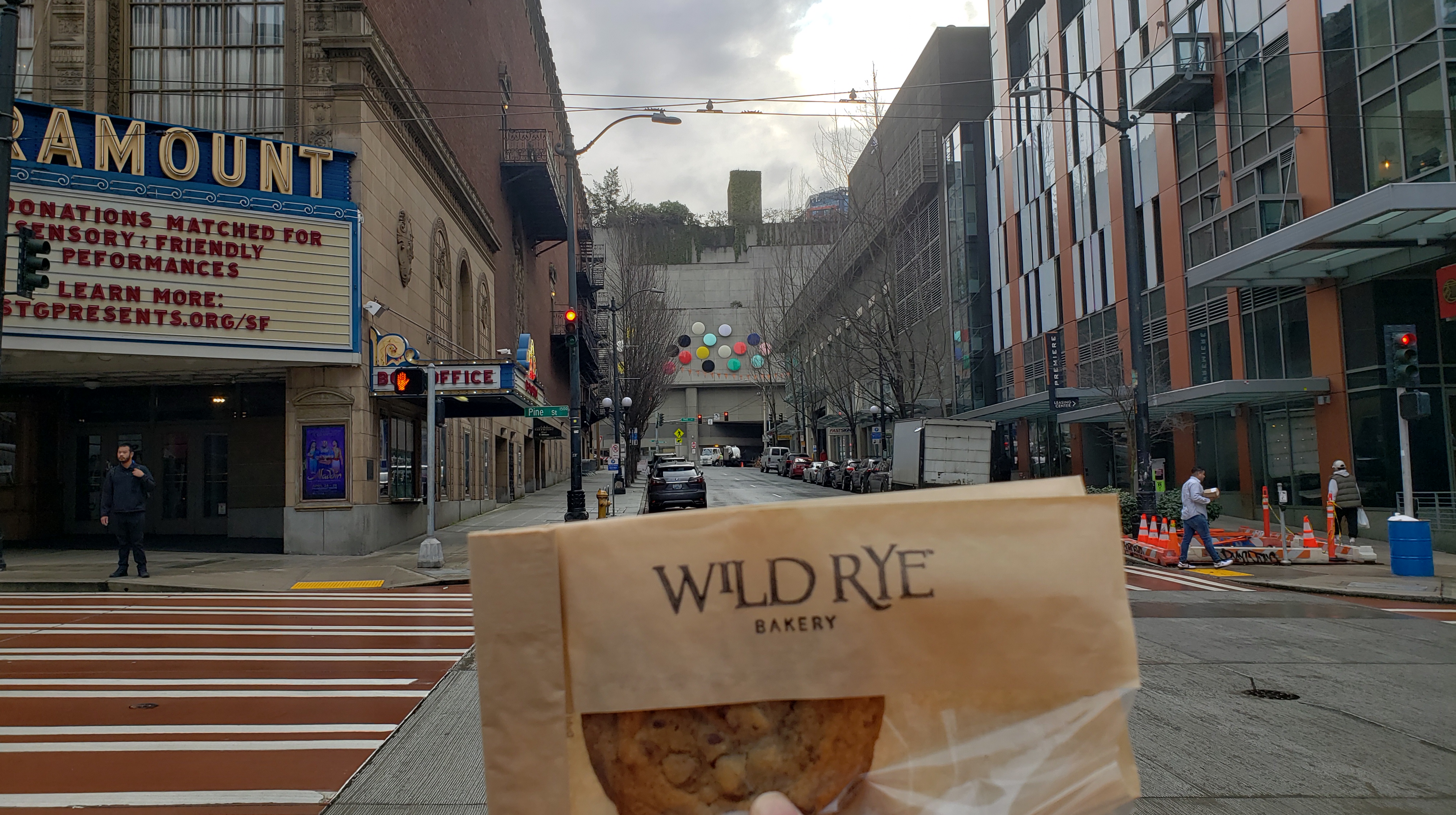One delicious bit of public access that has been provided is the Wild Rye bakery at the corner of Olive and Boren. This is a new storefront operated by the Convention Center’s catering department. Anyone can now get one of their tasty cookies for muffins for a reasonable price. Other retail so far includes a new streetside outpost for Monorail Espresso, Pike Brewing, Russian bakery Piroshki Piroshki, and Italian restaurant Bombo. The lobby also has public restrooms.