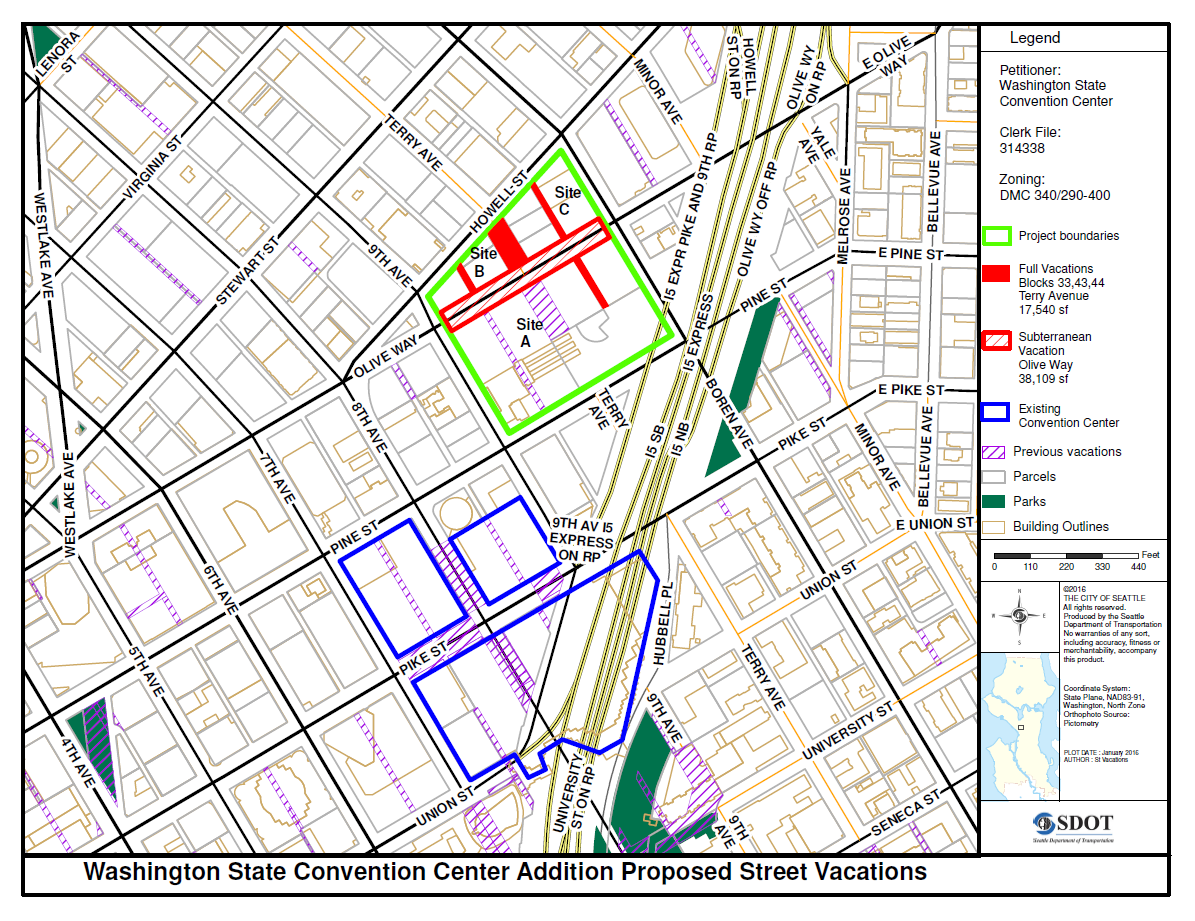 The Convention Center petitioned for a total street and alley vacation of 1.28 acres, the largest ever requested in Downtown. It was also the first request for a subterranean vacation under an arterial street in Seattle.