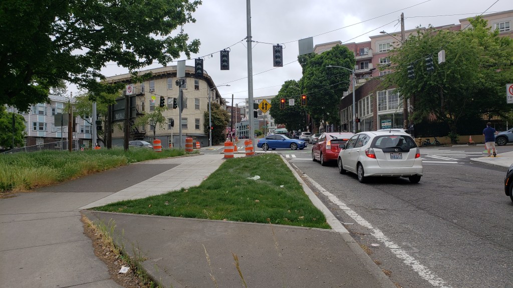 I was not successful in using the funding to also build more curb bulbs in a parking lane due to the engineers’ concerns around peak hour traffic flows. Overall, however, the Melrose project’s timing was fortuitous, and seeing results on the ground is better than waiting a long time for WSDOT to cooperate on the original intent for ramp redesign. This is illustrated by the multi-year saga to simply install a pedestrian-activated flashing beacon.