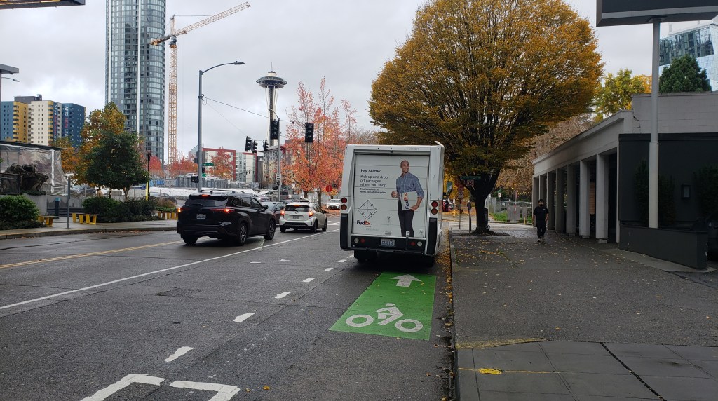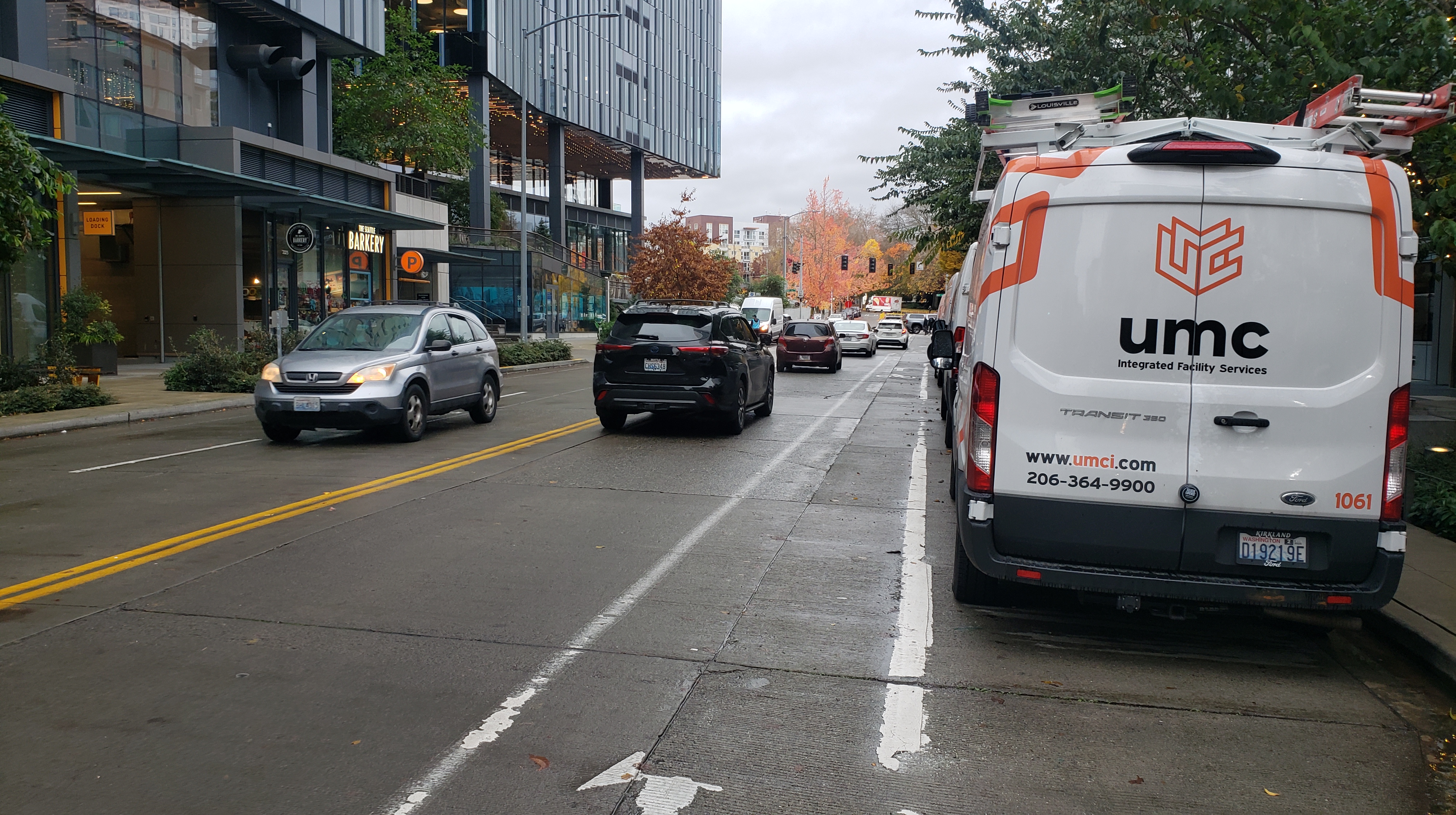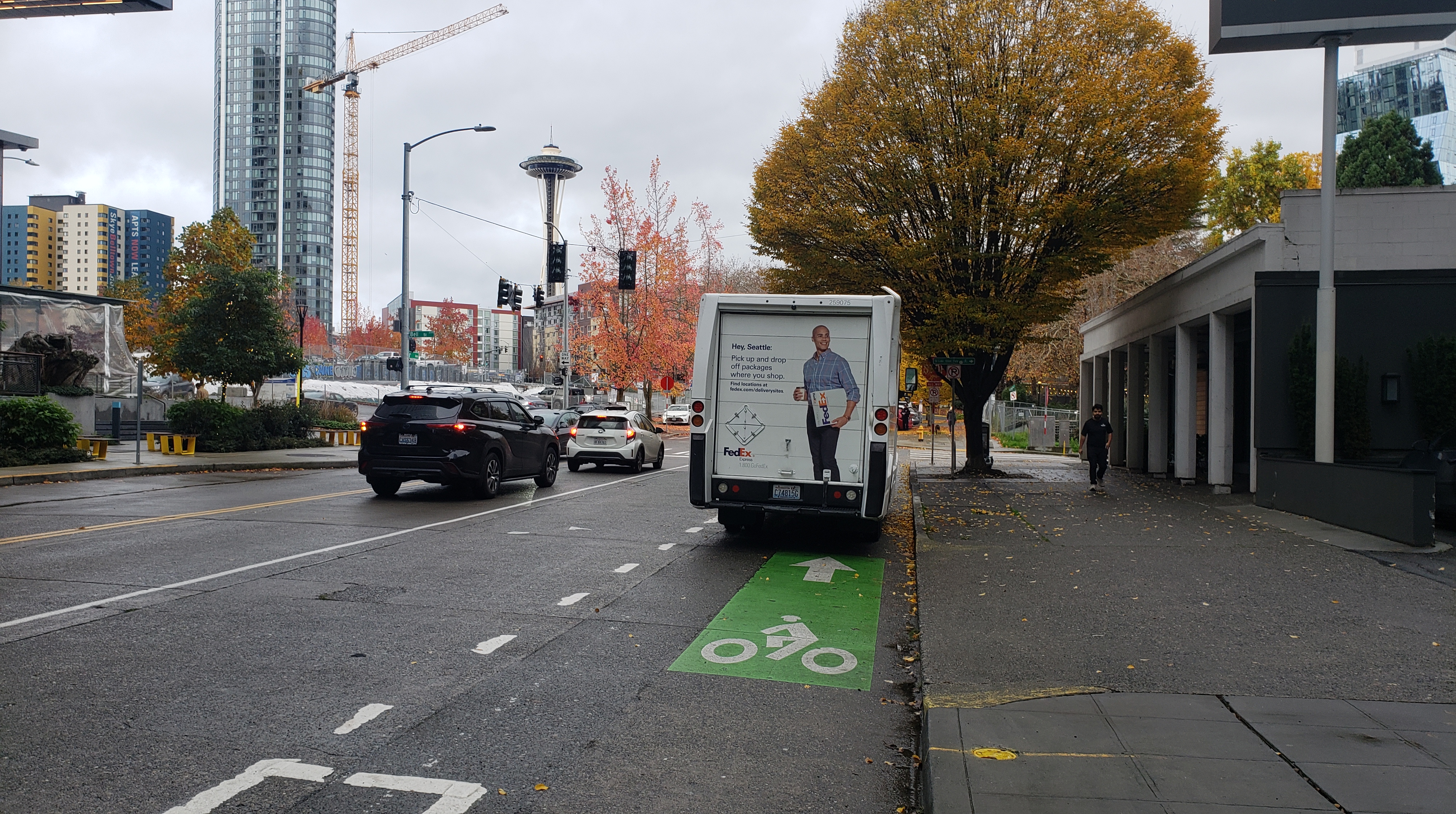 The current 8th Avenue bike lane is mostly on the left side of a one-way street, but on the last block north of Virginia Street it makes a switch to the right side of the street before ending at a turn pocket on Westlake Avenue. On the other side of Westlake, 8th Avenue is a two-way street and presumably the bike lane will continue being one-way northbound and end at the crosstown bike lanes on Bell Street. This two block stretch could certainly use the improvement as demonstrated by car maneuvers and parked vehicles on a recent visit.