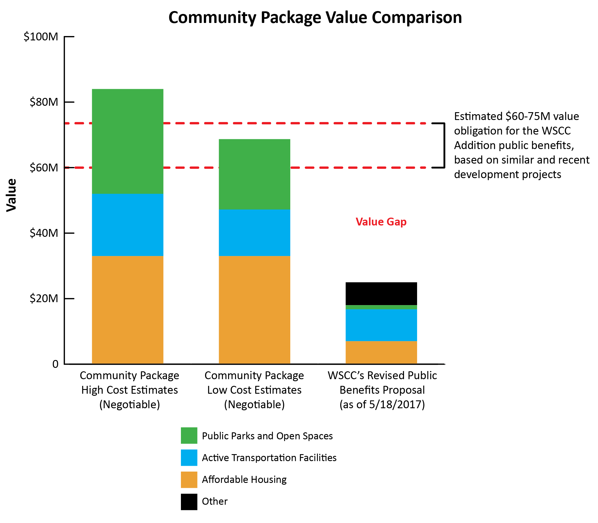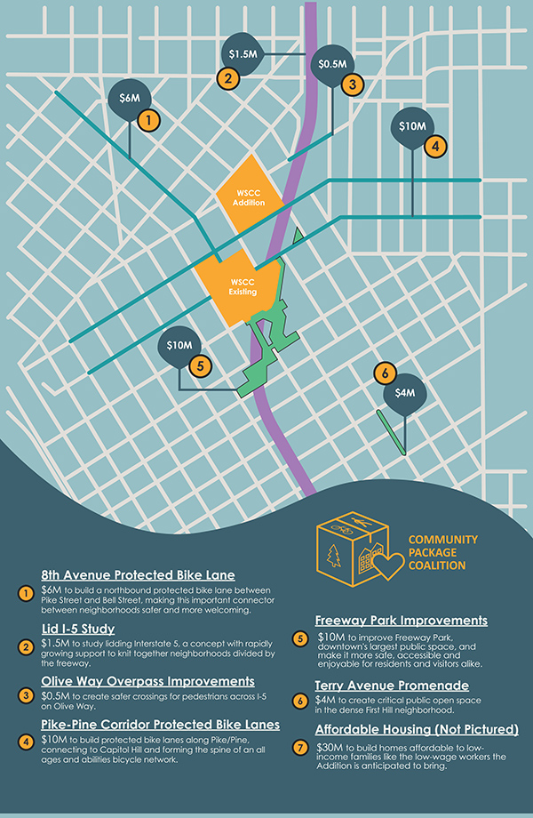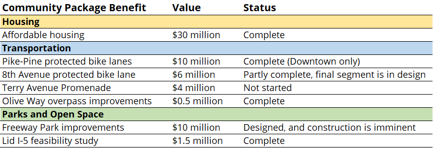 The final Community Package was agreed to in late 2017 and documented in a community benefits agreement. It contained seven initiatives requiring $62 million in direct payments to the City of Seattle: