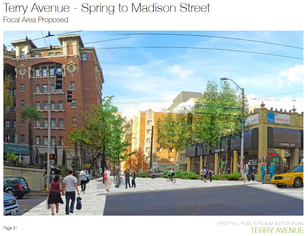 Terry Avenue pedestrian street. $4 million. First Hill continues to see rapid growth and new skyscrapers, even as it has long sought additional open space to serve its high density of residents. The acquisition of private land for public use has been increasingly expensive here. In recent years the community has embraced public right-of-way as an alternative opportunity for open space. Endorsed by the City in 2015, the Terry Avenue Concept Plan seeks to create 40,000 square feet of new open space by establishing a pedestrian-priority street on seven blocks of Terry Avenue between Spring and Terrace Streets. The funding from the Community Package will fund construction of two blocks between Cherry and Marion Streets.