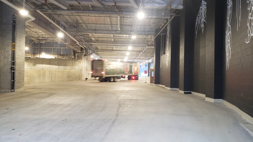 In addition to Convention Place, the project included two sites on the north side of Olive Way. These were to be “co-development” with an office building and a residential building, with revenues helping to pay off the main facility. The co-development also provided a unique opportunity to reduce the impacts of all the freight and truck traffic that are needed to support a major national event: The co-development would be built over a large spiraling ramp, which trucks would use to travel underground and below Olive Way to reach the new Convention Center basement.