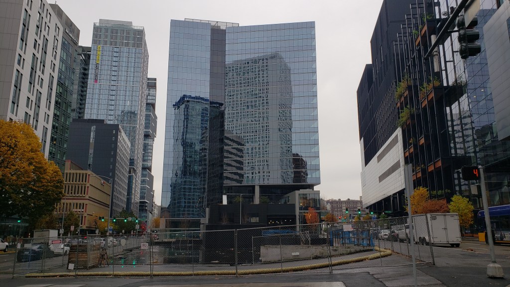 Of the two co-developments between Olive Way and Howell Street, the 17-story office building at 1000 Olive Way was completed in 2024 by owner Hudson Pacific Properties. Land use permits have expired for the 29-story, 404-unit apartment building at 920 Olive Way, but public records indicate that design work is ongoing and construction may begin in the next few years.