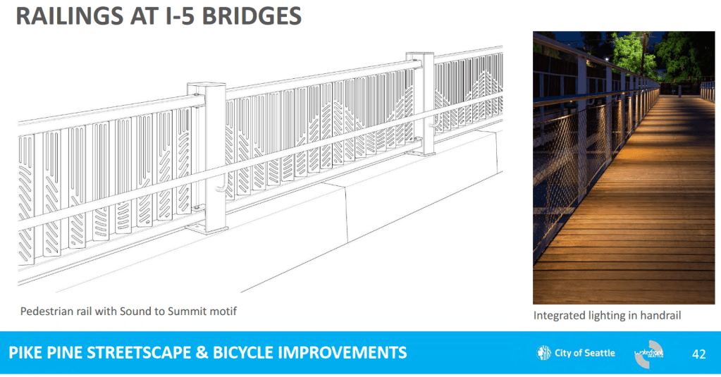 One other wrinkle occurred on the Pike Street overpass above Interstate 5. At first, new engineering standards from the Washington State Department of Transportation (WSDOT) did not permit the weight of additional concrete. After further structural calculations, WSDOT determined the original design could work. On one side of each of the two overpasses the sidewalks have roughly doubled in width and the bike lanes are protected with concrete barriers.